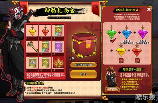 5月13日服务器维护~5月27日服务器维护后,玩家购买“神秘礼物盒”打开后会获得道具。收集右方全部的神秘宝石后可以获得:暗夜忍者套装。套装除了普通能力值之外,还有三种额外能力:投篮成功率增加2%,盖帽成功率增加2%,胜利时积分+100%。