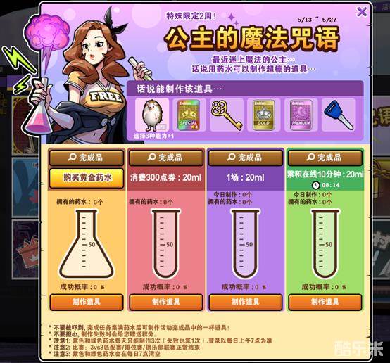 5月13日服务器维护后~5月27日服务器维护前,玩家参与公主的魔法咒语活动完成任务集满药水后可以制作活动完成品中的一样道具。制作失败时会给您赠送积分。紫色和绿色药水每天只能制作三次(失败也算一次)。登录以每日上午7点为准。3V3匹配赛&俱乐部联赛中可以进行活动。紫色和绿色药水会在每日7点清空。