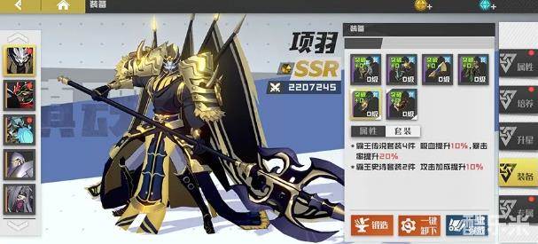 方面,推荐项羽装备手部、戒指2件“霸王史诗套”,以及头部、胸部、腿部、项链4件“霸王传说套”。前者可以提升10%的攻击加成,后者可以提升10%的吸血与20%的暴击率,能够帮助项羽有更稳定的续航能力和更强的输出能力。