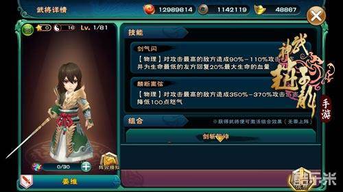 姜维是三国时期蜀汉著名将领、军事统帅,在诸葛亮去世后继承诸葛亮的遗志率领蜀汉军队北伐曹魏,在战争中屡出妙策且多有建树。为了塑造且真实还原姜维的人物形象,在《武神赵子龙》手游里技能的设定也比较贴合原著。物理技能“剑气闪”对攻击最高的敌方造成90%-110%攻击伤害,并为生命最低的友方回复20%最大生命的血量,麟断离弦对攻击最高的敌方造成350%-370%攻击伤害,降低100点怒气。
