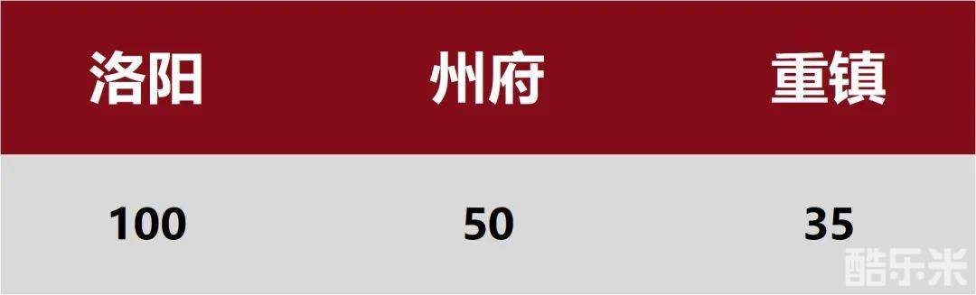 本赛季中州府、重镇拥有不同的占领值。另外,洛阳作为兵家必争之地,将提供大量占领值。具体数值如下: