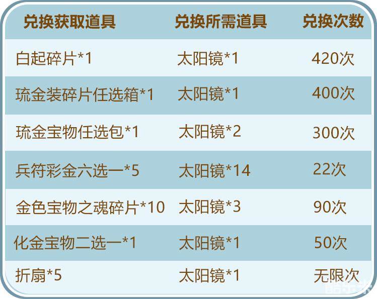 「太阳镜」可用来兑换白起碎片、琉金装碎片任选箱、琉金宝物任选包等稀有资源: