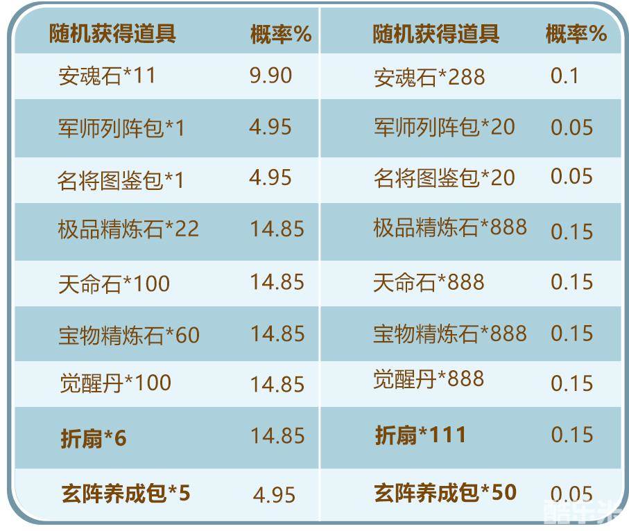 3.「清凉礼盒」可开出:折扇*111、玄阵养成包*50、觉醒丹*888、天命石*888、极品精炼石*888、安魂石*666、军师列阵包*40、名将图鉴包*40、宝物精炼石*888、折扇*6、玄阵养成包*5、觉醒丹*100、天命石*100、极品精炼石*22、安魂石*11、军师列阵包*1、名将图鉴包*1、宝物精炼石*60中的随机1种。