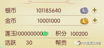 游戏中主要流通货币分为银币、金币、莲玉,莲玉属于最高级别的货币,可以兑换银币和金币,除了上述货币外还可以通过日常任务或活动获得积分、活跃、帮贡等代币,这些代币可以通过一些特定的商城兑换道具;