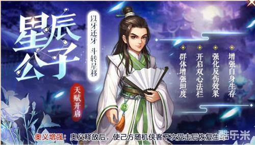 星辰公子开启天赋后,奥义释放完成,使己方1名随机侠客下次受击后恢复30%最大生命值。天赋二阶开启自身受到的治疗和护盾效果提高30%,天赋三阶开启后,攻击者下次攻击时受到的反伤伤害提高15%,持续1回合。天赋四阶开启后,受到攻击后获得对方10%内里,上限3次持续整场。天赋五阶,将额外解锁一个心法栏,天赋六阶后,己方七伤侠客获得反伤比例30%,让团队变得更强。
