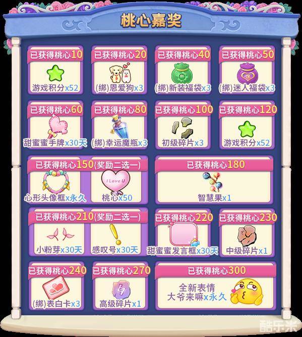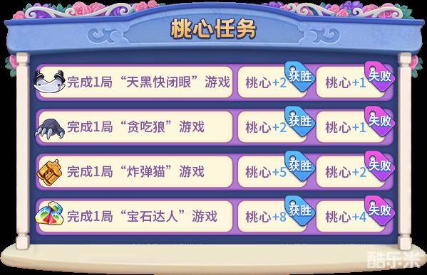 活动期间,完成游戏任务可获得“桃心”,在获得足够“桃心”后可领取桃心嘉奖!