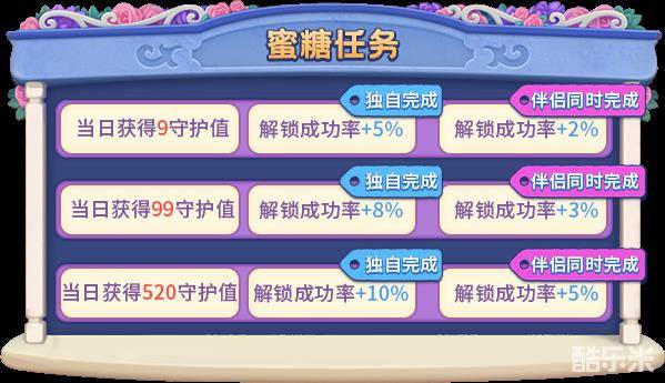 爱之女神送你一份“蜜糖宝箱”!但“蜜糖宝箱”初始解锁成功率为0%,通过完成活动指定任务,增加解锁成功率吧!在活动期间任意时刻都能打开宝箱,但您的“解锁成功率”会决定是否能成功开启,当你成功开启宝箱,就能领走其中所有奖励,如果失败,您还有一次重新打开宝箱的机会,但“解锁成功率”必须达到100%才可再次开启。