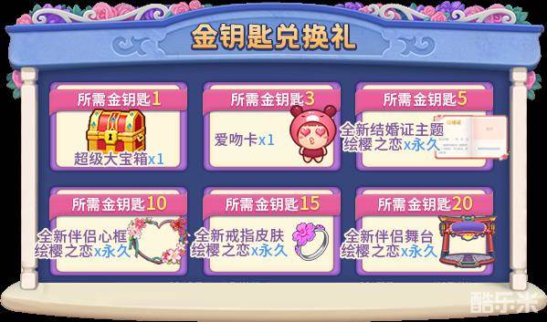 奖励二:当累计消费50000金币后,每额外消费5000金币,即可获赠1枚“金钥匙”,使用“金钥匙”可在活动中兑换特别奖励!无论是否兑换,每当您累积获得100枚金钥匙,可立即获得情侣自定义套装特权!