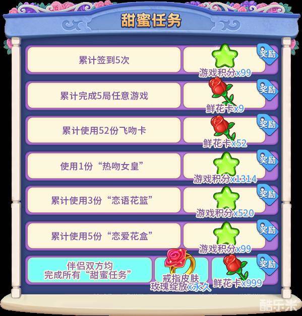 4、 当伴侣双方都完成甜蜜任务后,才能领取“戒指皮肤·玫瑰绽放”和鲜花卡奖励。