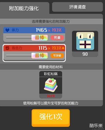 探险家进入“附加能力强化”选项内,选择对宝可梦需要强化的附加能力,通过消耗一定的松糕,即可提升宝可梦附加能力的百分比。