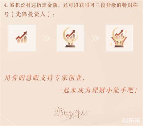 5月13日更新后,本次及以后的新项目中,将加入全新的【专家创业】玩法。玩家可以分配玩法专属的【财务金】,为专家们的创业拨款,次日即可查看盈利情况。盈利将由每天变化的【专家潜力值】决定。潜力值增加,收益增加。累积收益达指定金额,完成事项时的属性值也会获得加成;反之则会减少。当累积收益达指定金额,还可以获得可三段升级的特别称号【先锋投资人】。一起来成为理财小能手吧。
