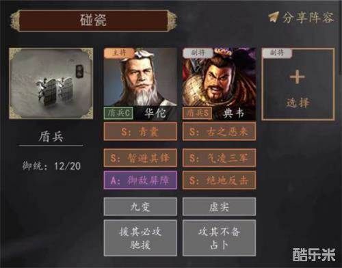 华佗:暂避其锋+御敌屏障;九变-援其必攻+驰援