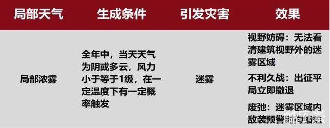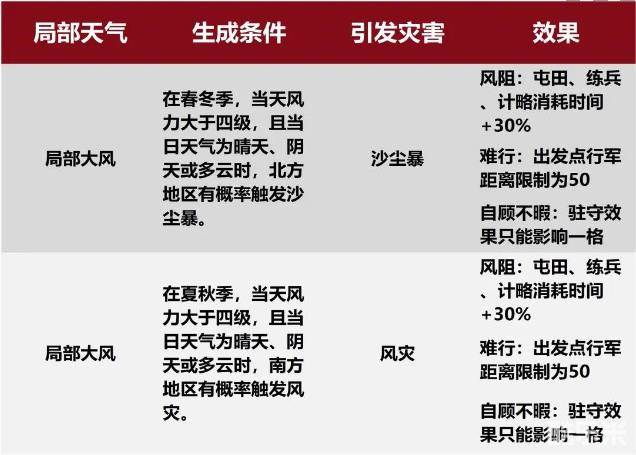 在增加了全新的风力状态后,大风天气能引发沙尘暴或是风灾。全新局部天气和灾害如下表所示: