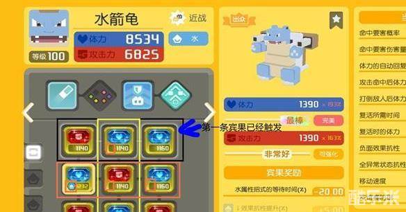 我们以如图所示的水箭龟为例,第一条宾果属性不需要附魔属性结晶,如黑框框起的三块方石,已经触发。第二第三条宾果对应的方石都需要附魔宾果词条左侧显示的水系属性结晶才能触发,因此需至少要将如图所示的橙色框和黄色框内的方石附魔成水系方石。