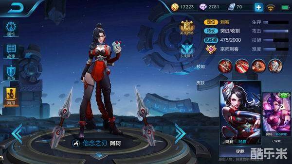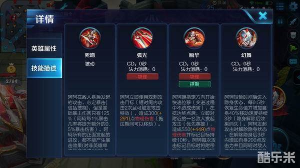 死吻:阿轲的被动技是所有在背后发起的攻击都能引起暴击,还能伴着暴击率的提升增加额外攻击,但是所有正面都不会出暴击,这就意味着,阿轲在背后才能打出超高伤害,所以此技能可以用来追击残血英雄。