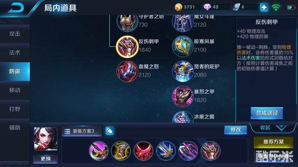 暗影战斧能够加攻击和减冷却还能加生命值,保障阿轲在输出时的安全,而反伤刺甲则可以变相增加阿轲的生存能力,绕后。
