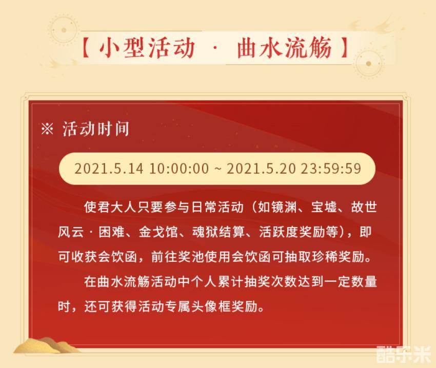 在本次“曲水流觞”活动期间,各位玩家“使君”要参与日常活动,即可获取“会饮函”,如通关故世风云普通、故世风云困难、宝墟、仙喵指路副本,魂狱每日结算,参加金戈演武、沙盘演略战斗并取胜,活跃度达到100,奇遇/支线剧情任务,喵游园等。