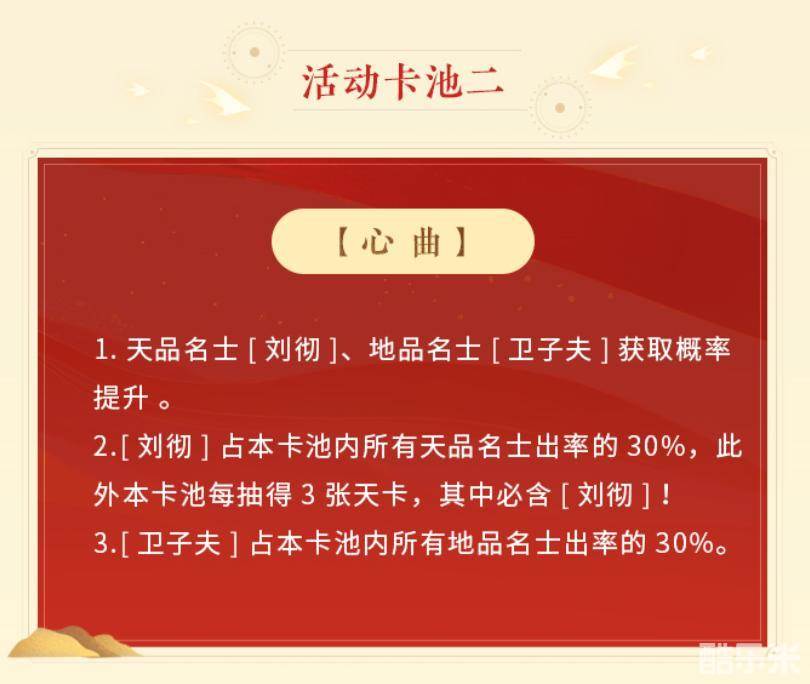 除了趣味的“曲水流觞”活动之外,还有名士活动卡池UP来袭!天品名士嬴政、刘彻的获取概率将大大提升!