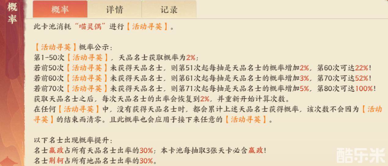 在本次活动卡池中寻英,累计50抽没有获得天品名士时,会累计增加此后获得天品名士的概率,累计概率在任意活动卡池内共享(包含此后的新活动卡池),具体数值可通过寻英界面卡池详情查看!