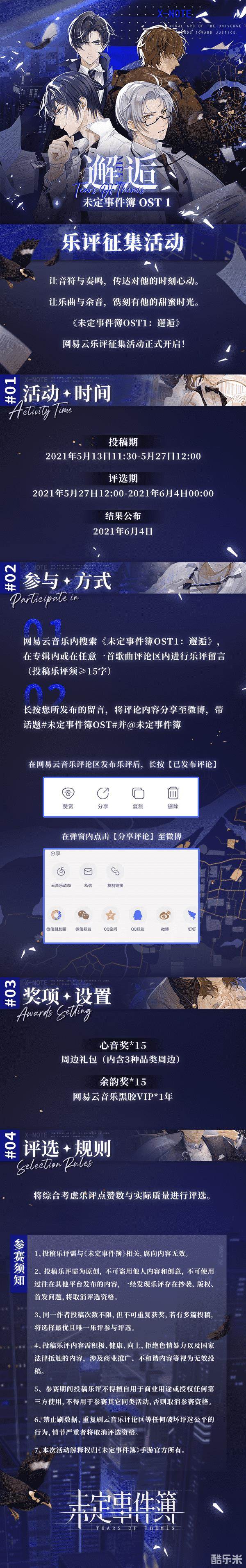同时,《未定事件簿OST1:邂逅》网易云乐评征集活动正式开启!2021年5月13日11:30-5月27日12:00,在网易云音乐平台搜索《未定事件簿OST1:邂逅》,在专辑内或任意一首歌曲评论区进行乐评留言(有效投稿乐评须≥15字),长按所发布的留言,将评论内容分享至微博,带话题#未定事件簿OST#并@未定事件簿,即有机会获得精美周边礼包、网易云音乐黑胶VIP年度会员等奖励。