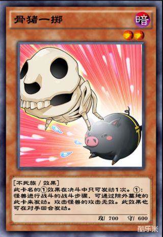 效果:怪兽进行战斗的战斗步骤时,把墓地的这张卡从游戏中除外才能发动。那只怪兽的攻击无效。这个效果在对方回合也能发动。’骨猪一掷’的效果在决斗中只能使用1次。二速墓坑。