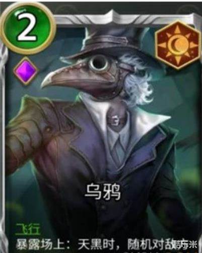 乌鸦:自带飞行属性拥有一定保命能力,而在天黑后减2信用点有时会有奇效,可破除护甲,秒杀低信用点契灵,使对方唯一暴露牌死亡等等都是不错的交换效果。