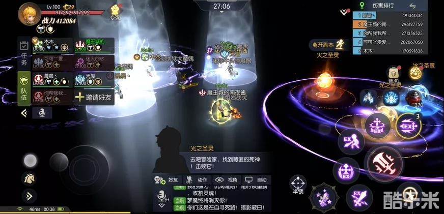 boss隐身,并召唤被魔化的圣灵(绿色)释放持续的冲击波攻击玩家,此时需要集合减伤加血,不然会死(伤害巨高)。冲击波结束后,会有几名玩家头上出现手电筒,用手电筒找到死神后,进入p2阶段。
