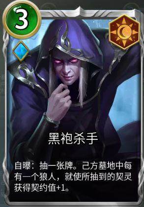 黑袍杀手抽到契灵的契约值随墓地狼人数量的增加而增加,配合上文中提到的各种花式召唤狼人的卡牌,抽到卡牌的契约值很容易就超过4点,令对手无法翻开我方卡牌,只能干瞪眼!黑袍执事则是后手的必翻牌,可以白赚一个村民,因其技能没到天黑既可召唤的特性,足以在次日吸引对手火力,在拉开卡差的同时也能使我方狼人存活时间更长。