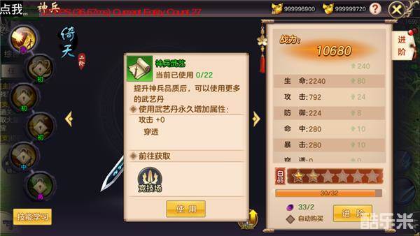 除了以上两项可提高神兵附加技能和阶级外,还可使用武艺丹提升神兵的攻击属性。神兵品阶越高,可使用的武艺丹越多,提升的属性也越多。武艺丹可使用洪武积分在竞技场商店换取,每人每天限换取1个。,