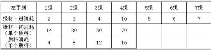 所以平均提升各个神兵的三个质料达到1级但是不去提升除了左手剑以外的神兵等级,是一种提升功力最快的养成方式,所需的质料和缘材·初花费比较少,而且也不怎么需要过多的缘材·进就可以获得不俗的功力加成。