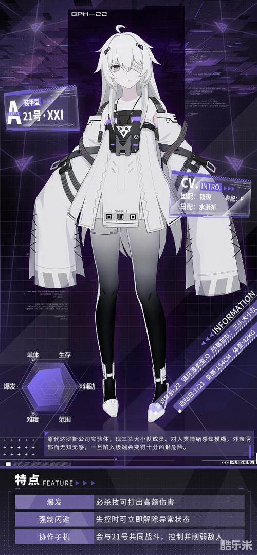机体名ΧΧΙ,装甲型。外表是娇小的少女,在人类时期由于体质欠佳,大部分生命活动都依赖于随行医疗机的支援。对人类情绪感知模糊,外表阴郁而无知无感,一旦陷入极端会变得十分凶狠危险。武器是随行的支援伙伴呼噜。