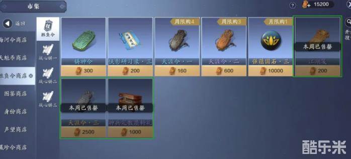 必要购买物品:7.5折帮贡,侠影突破丹·金,冶玲珑·神,2.5折缘材·初,每日诸神令,缘材·进。下周一定要留5000海河令去兑换缘材·进,这个材料产出极少,是升级神兵的富裕购买物品:5折缘材·初,不打折帮贡。