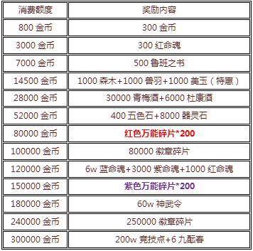 【活动内容】活动期间,游戏内累计消费达到对应金币,即可获得对应奖励;所有商品绝对超值,不信你自己看。相中哪个千万别手软!因为一犹豫也许就不知道何时能再见了。