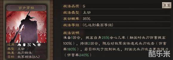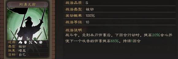 百步穿杨第二段是控制触发:配合控制武将是最优选择,依靠战法实现控制也可以,因为盛气会影响刚勇的触发,所不太推荐携带。