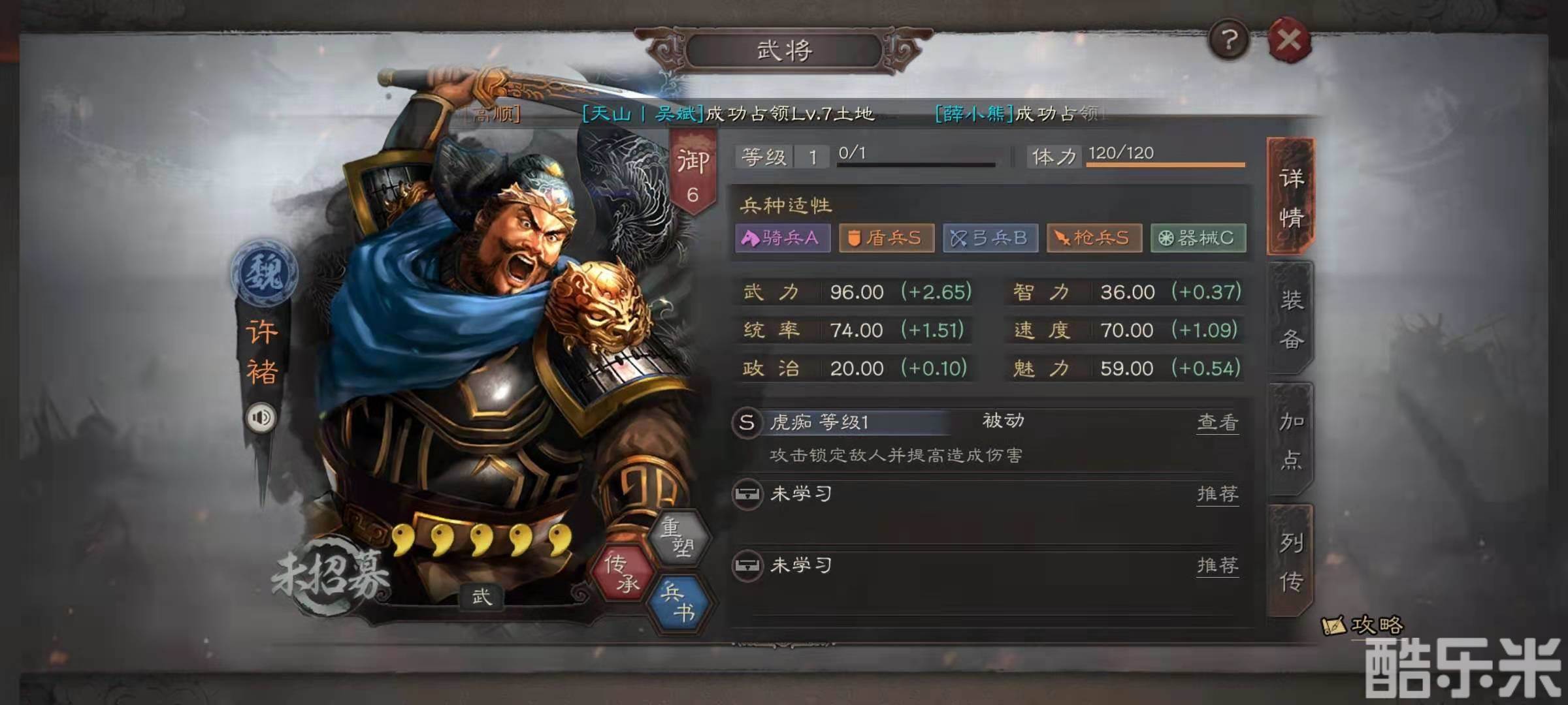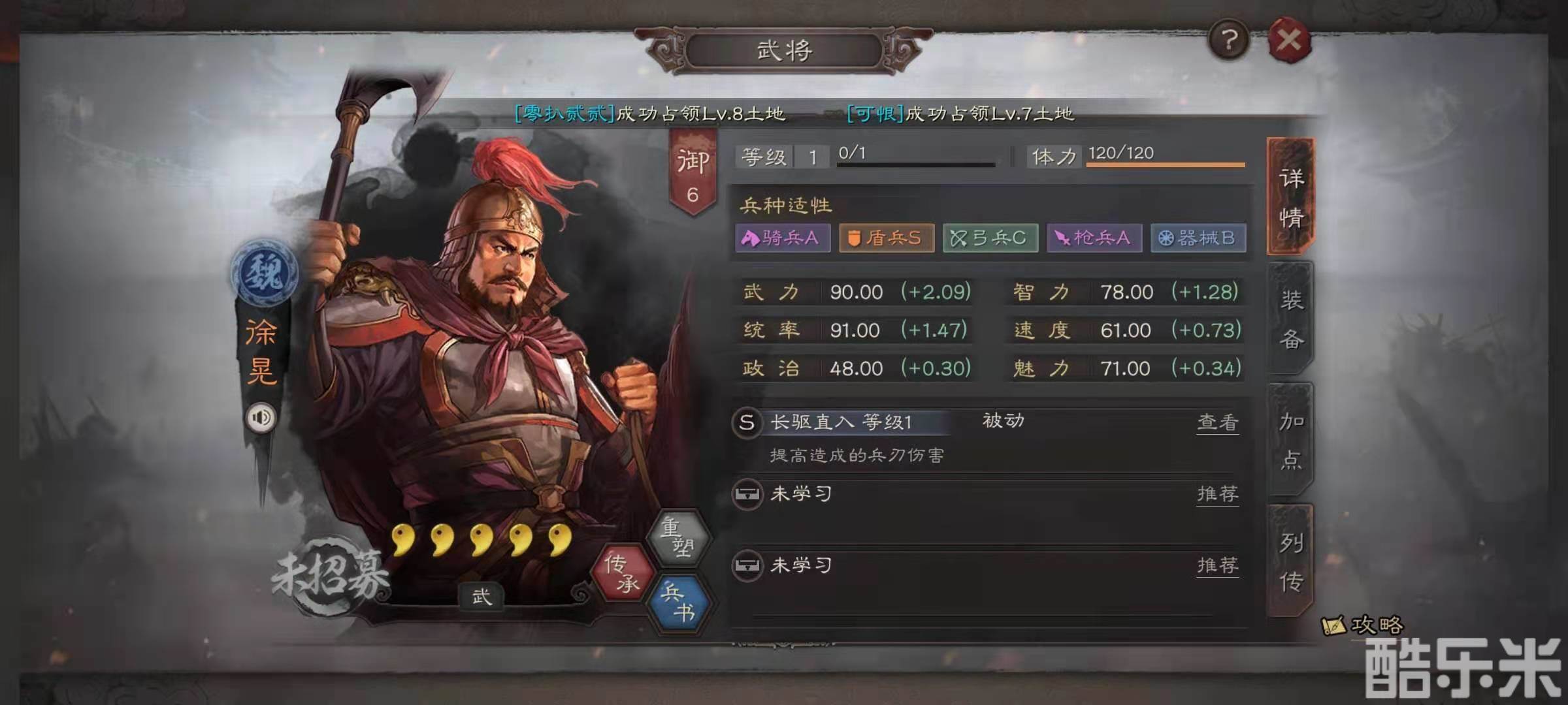 徐晃的初始武力是90点,略低于许褚,但是也是在一流武将之列,自带战法长驱直入,效果是在自身出手之后,就能叠加一层伤害加深效果,最多可以叠加到5层,满级一共是75%的伤害加成。徐晃的伤害一直都非常稳定,有了曹操的加成,即使不依靠战法,也能砍得对方刀刀见血。这三名武将的统御都不是特别高,徐晃和许褚都是6点,所以很早就能一起上阵。