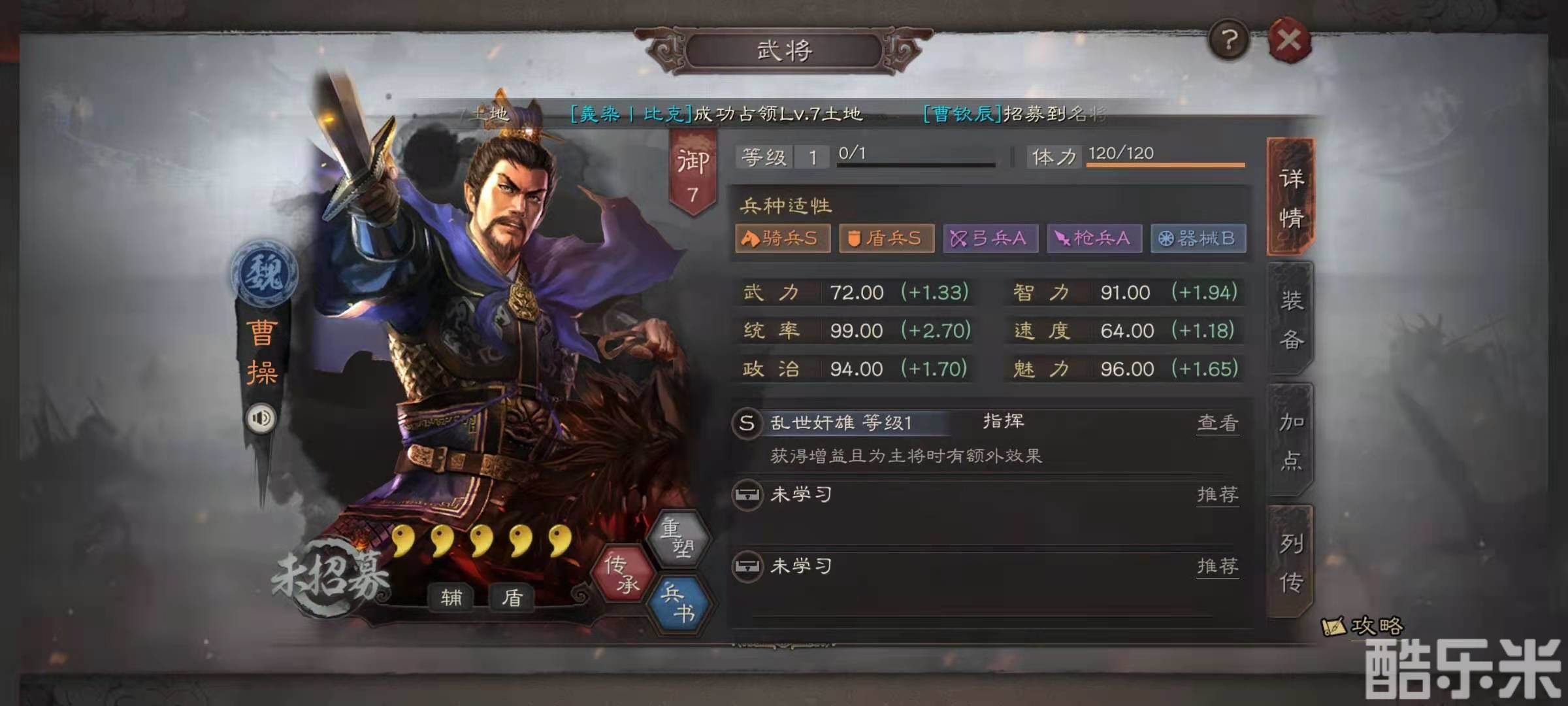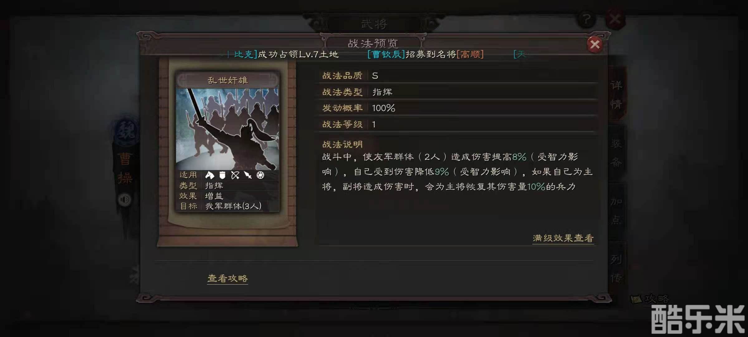 曹操是魏国盾系武将的核心,也是最强的辅助武将,初始统率达到99点,这就绝对了曹操拥有超常的硬度。曹操的自带战法是乱世奸雄,效果是在开战之后,己方的两名武将可以获得伤害提升效果,而曹操自身则获得伤害降低效果,同时其他两名副将造成伤害的时候,主将曹操还能恢复一部分血量,这样曹操就成了顶在前面的超级肉盾了,只要搭配强力的输出就可以了。