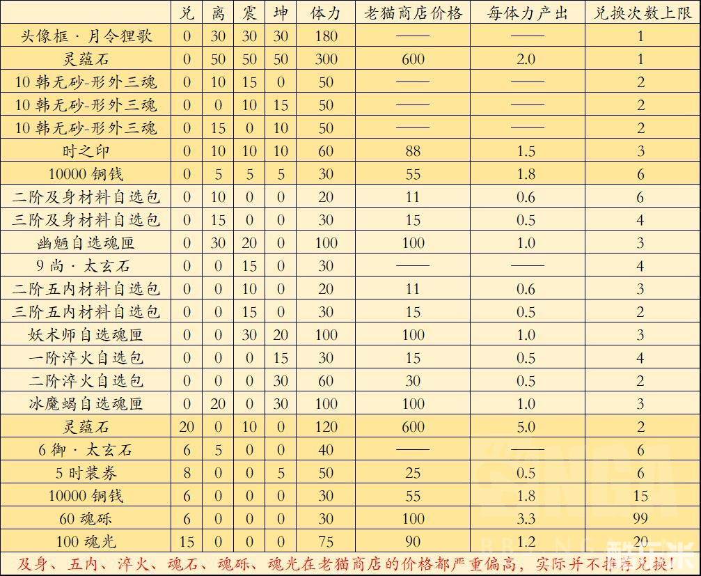 目前来看,推荐兑换的是灵蕴石、韩无砂-形外三魂、时之印、铜钱和御·太玄石,头像框、时装券、自选魂匣、魂砾和魂光可按需兑换,及身、五内、淬火自选包则非常不推荐兑换。