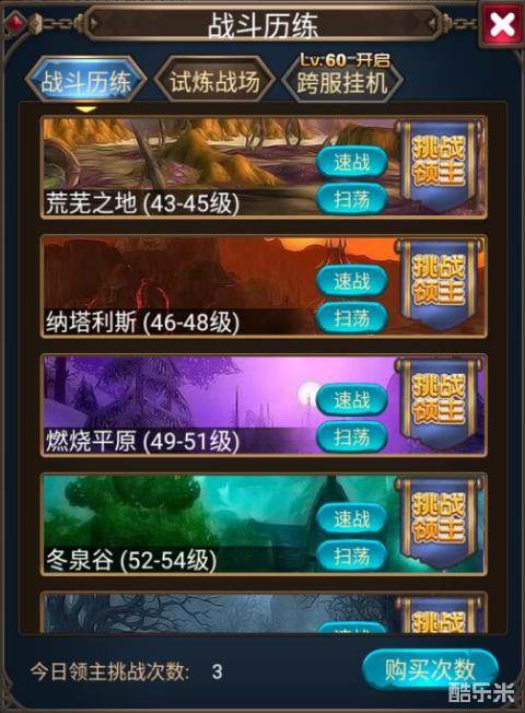 挂机地图分为战斗历练、试炼战场、跨服挂机三个部分。