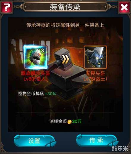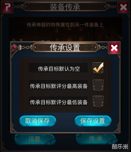在传承的时候有一个设置功能,可以自动默认成评分最高的装备,也可以默认为评分最低装备。如果自己想手动选择装备,可以选择传承目标默认为空。