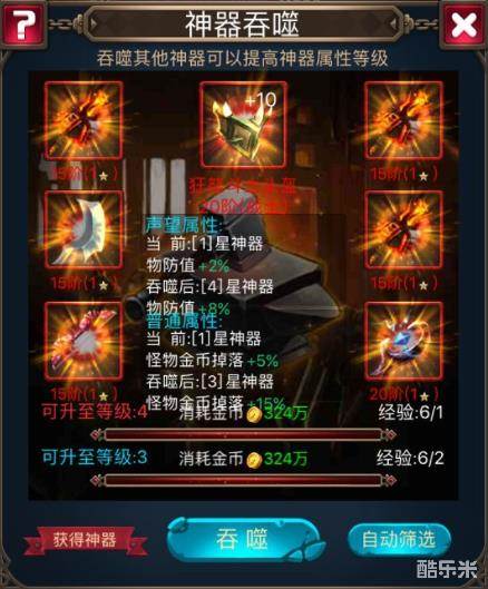 神器通过吞噬其他神器来提升神器属性的等级。吞噬获得经验与被吞噬的神器的等级有关。当经验值满值时神器会升级并且属性会获得提升。