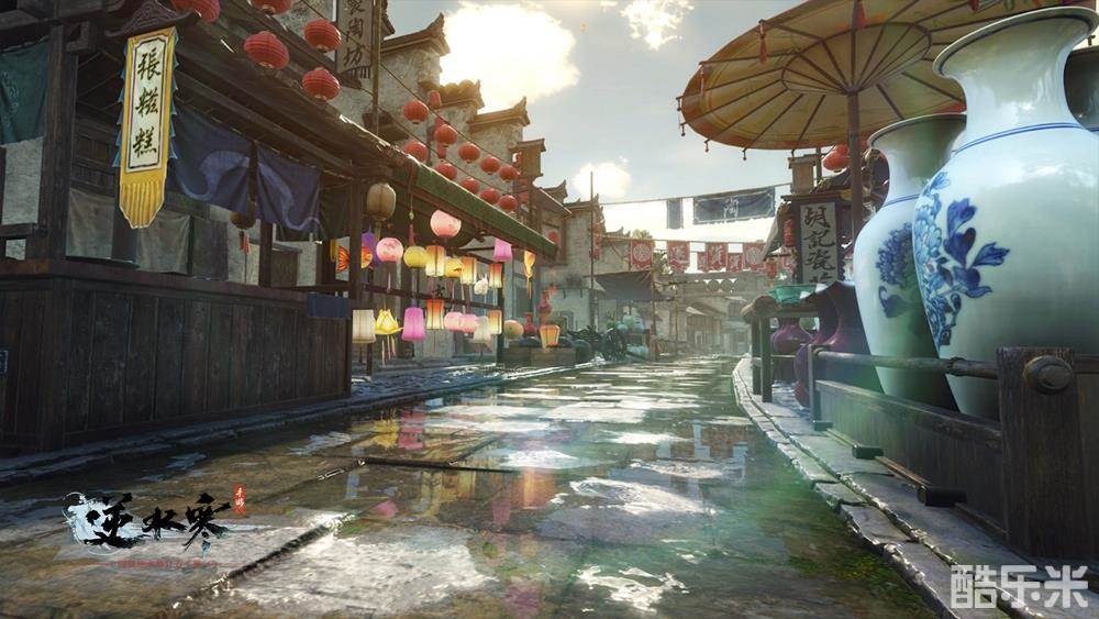 视频中特意用带有炫技意味的方式,展示了一幕“雨后石板街道”的光纤追踪场景,在多重光照及多种材质表面对光线的交叉反射之下,整体画面真实感十足,积水灵动剔透,效果非常吸睛。目前这项技术在手游中的应用还是空白,《逆水寒手游》艺高人胆大地兵行险招,展示地该品牌在游戏画面上一如既往的野心。