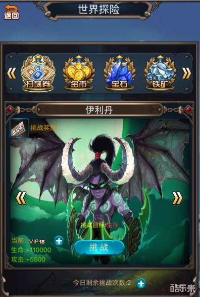 12级开启世界探险功能,每天可以进行两次免费挑战,这里可以获得扫荡券、金币、宝石等一些物品,坚持的回合数越高获得的奖励越丰富。