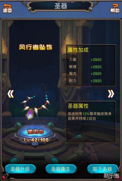 要想让圣器更加强大,千万记得给圣器升级升阶,升级后可以提高圣器触发技能的能力和触发概率,圣器等级越高,加成的属性也就越多。