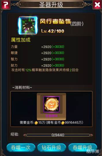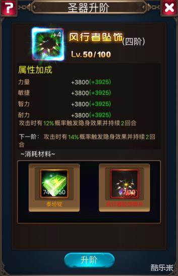 圣器升级需要消耗圣器精华。等级越高相应消耗的材料也就越多。圣器升级页面有三个升选项。