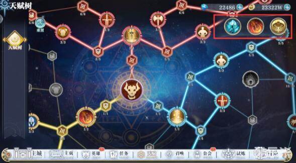 游戏中玩家解锁天赋系统需要通过主线关卡1-4的挑战,在通关之后玩家领取任务奖励时会获得一个天赋点的奖励。在天赋系统中,根据效果可以分为几个类别,分别是给玩家提升攻击,防御,血量等基础属性的被动增益型天赋,这些天赋能够给玩家时刻提供支持;其次是给玩家提供特殊的天赋技能的主动效果型技能。