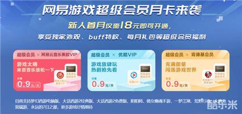 网易游戏超级会员开启月卡、季卡全新权益套餐,新人首月仅需18元即可开通,畅享独家定制会员外观、会员BUFF特权、每月会员礼包等尊享服务。除此之外,网易云音乐黑胶会员倾情加盟联合会员,现在开通低至0.9元/天,还有优酷、饿了么等会员特权可供选择。
