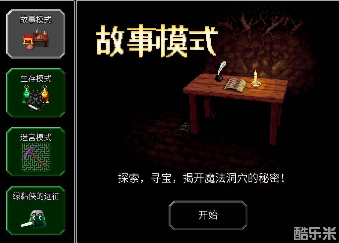 进入游戏后玩家首先需要选择游戏模式。故事模式是基础,剩余三种模式是基于故事模式附加一些额外条件。生存模式中玩家需要挑战更多的怪物,迷宫模式会给玩家赠送十个镐子,绿黏侠的远征则是玩家操作史莱姆进行冒险。