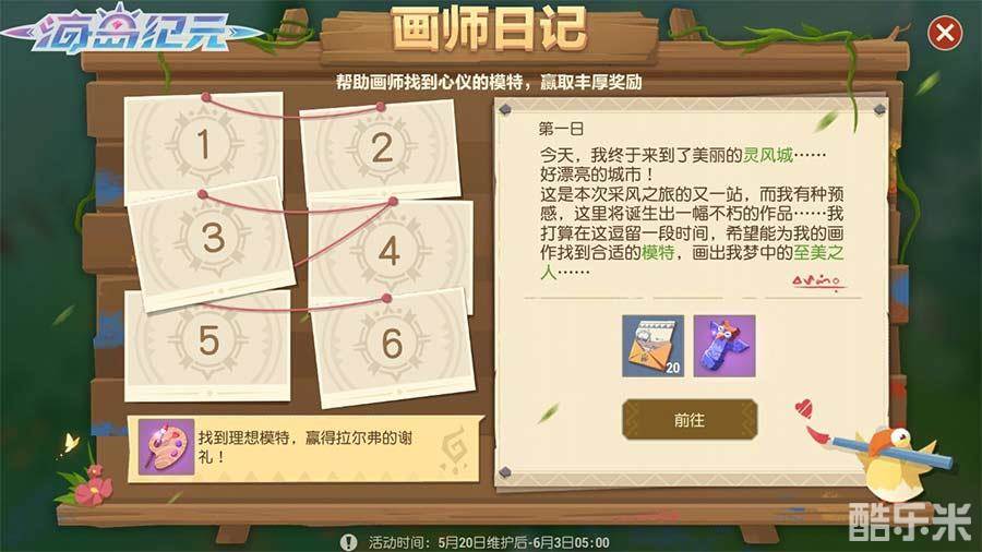 新来的画师开启了在卡琅古世界的采风之旅,但他正苦于找不到心仪的模特,画出梦中的至美之人。来「画师日记」帮拉尔弗找到理想模特,赢取海民感谢信、乞灵图腾等丰厚奖励吧!