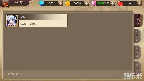 进入“好友”系统以后,我们能看到这样的界面,“好友”界面是我们的好友列表,我们能看到自己已经加的好友的信息,添加好友能够获得奖励,每天可以给好友赠送“爱心”,好友可以回赠给你!爱心可给魔力空间提供经验加成,助你英雄成长快人一步。