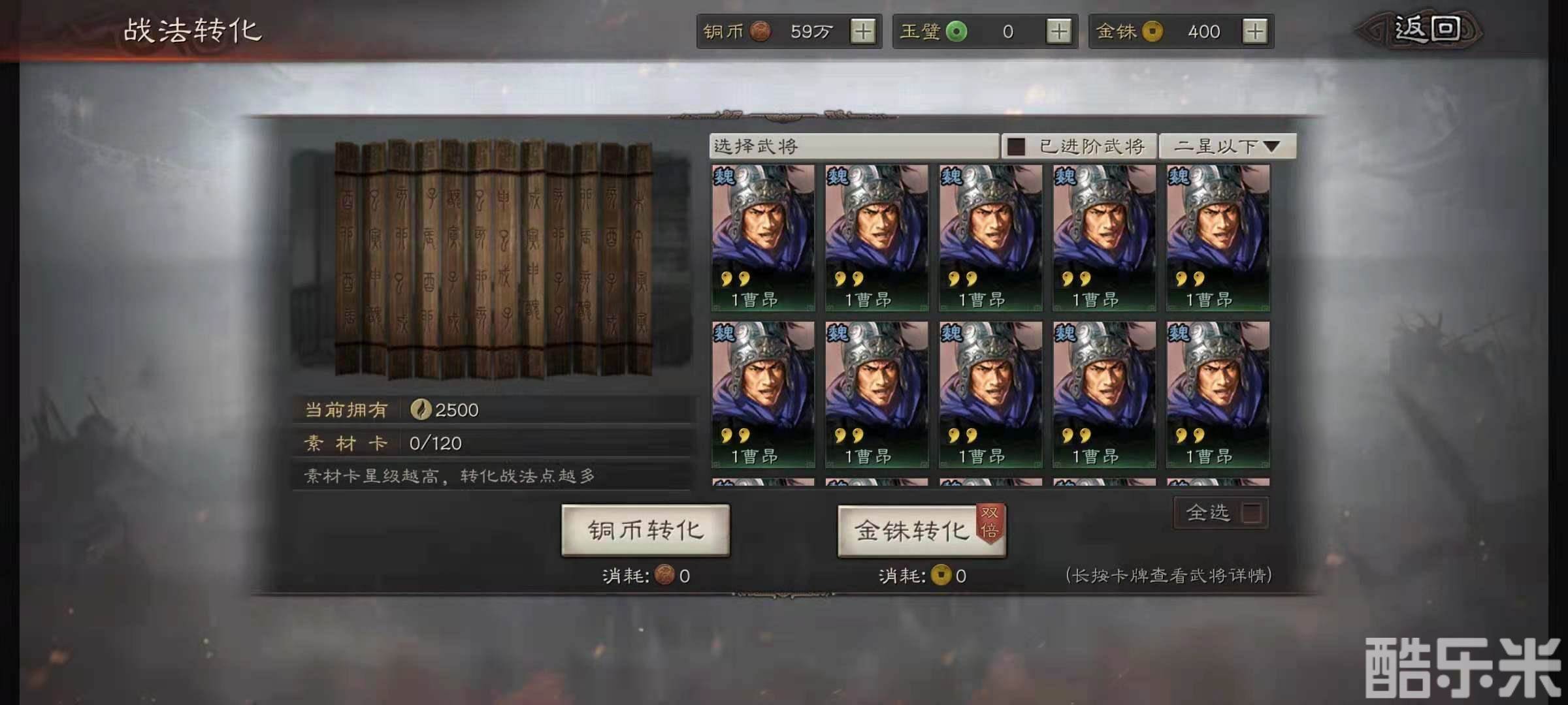 要想做到无伤开荒,我们需要在赛季开始之前就先做好准备,因为新赛季会把玩家所有的武将,战法和战法点都清零,所以我们需要准备的大量的低阶武将卡。低阶武将卡的作用就是在新赛季开始之后快速分解得到大量战法点数,然后把武将的三个战法全部升级到顶级,战法等级高了自然兵力损失就小了。